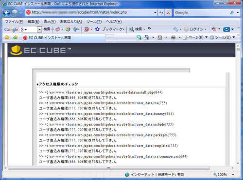 4.フォルダやファイルのアクセス権限のエラーがでますのでパーミッションの変更をします。
