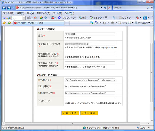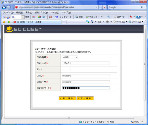 7.ECUCUBE用のデータベースを作成したDB名、DBユーザー、DBパスワードを入力し、【次へ進む】をクリックします