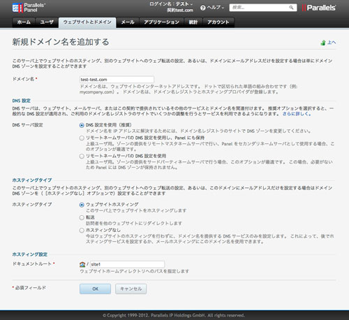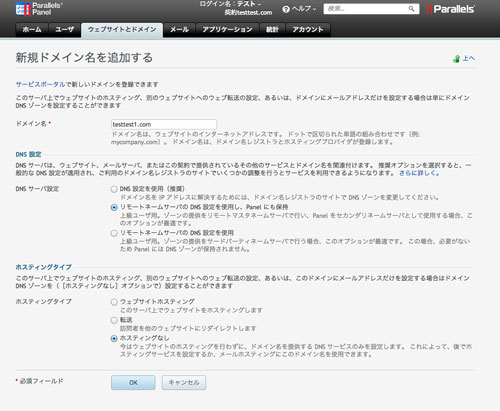 1.取得したドメイン名を入力し、DNSサーバー設定【リモートネームサーバのDNS設定を使用し、Panelにも保持】をチェックを入れ、【ホスティングなし】にチェックを入れ、OKをクリックします。